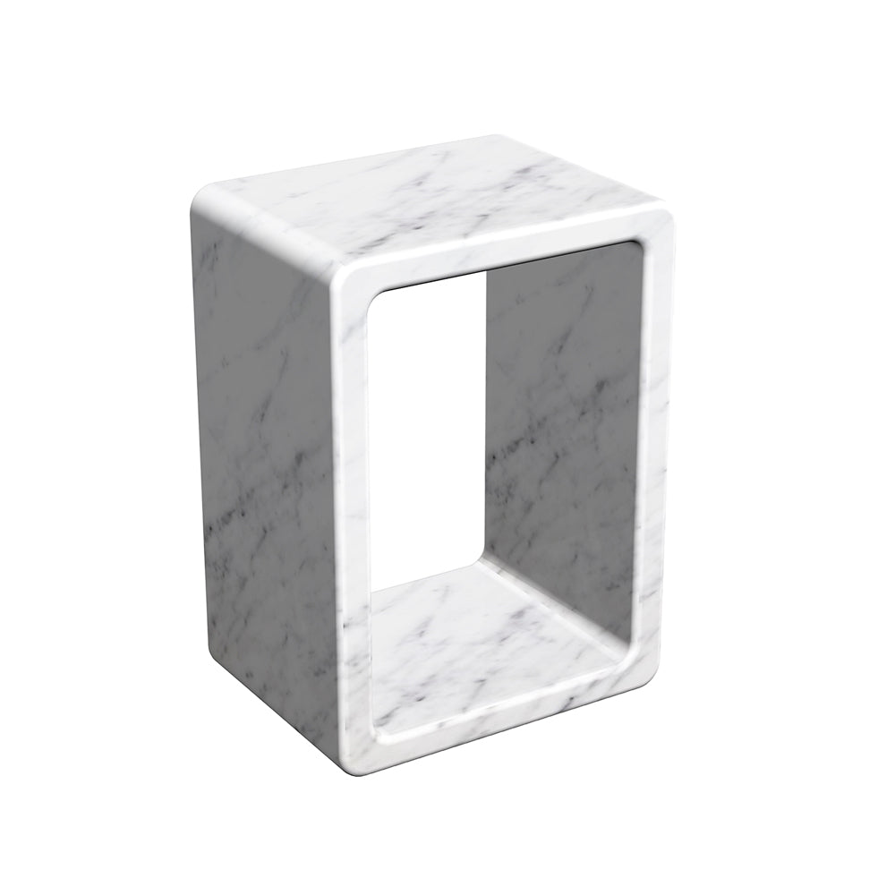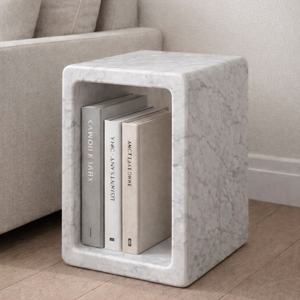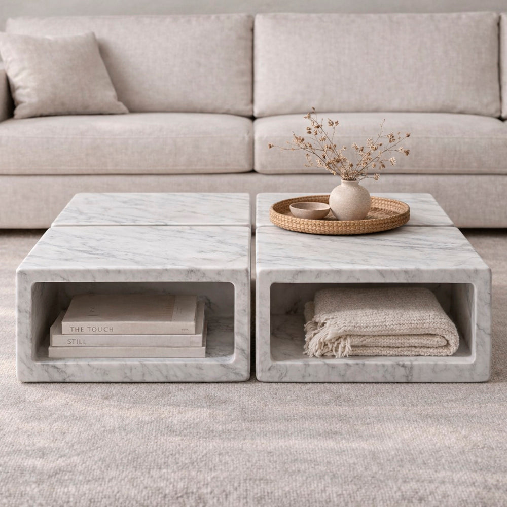 Fabricada en mármol natural, cada mesa presenta vetas únicas que hacen que ninguna pieza sea igual a otra. Su grosor de 4 cm y sus bordes suavemente redondeados generan un equilibrio perfecto entre solidez estructural y ligereza visual.