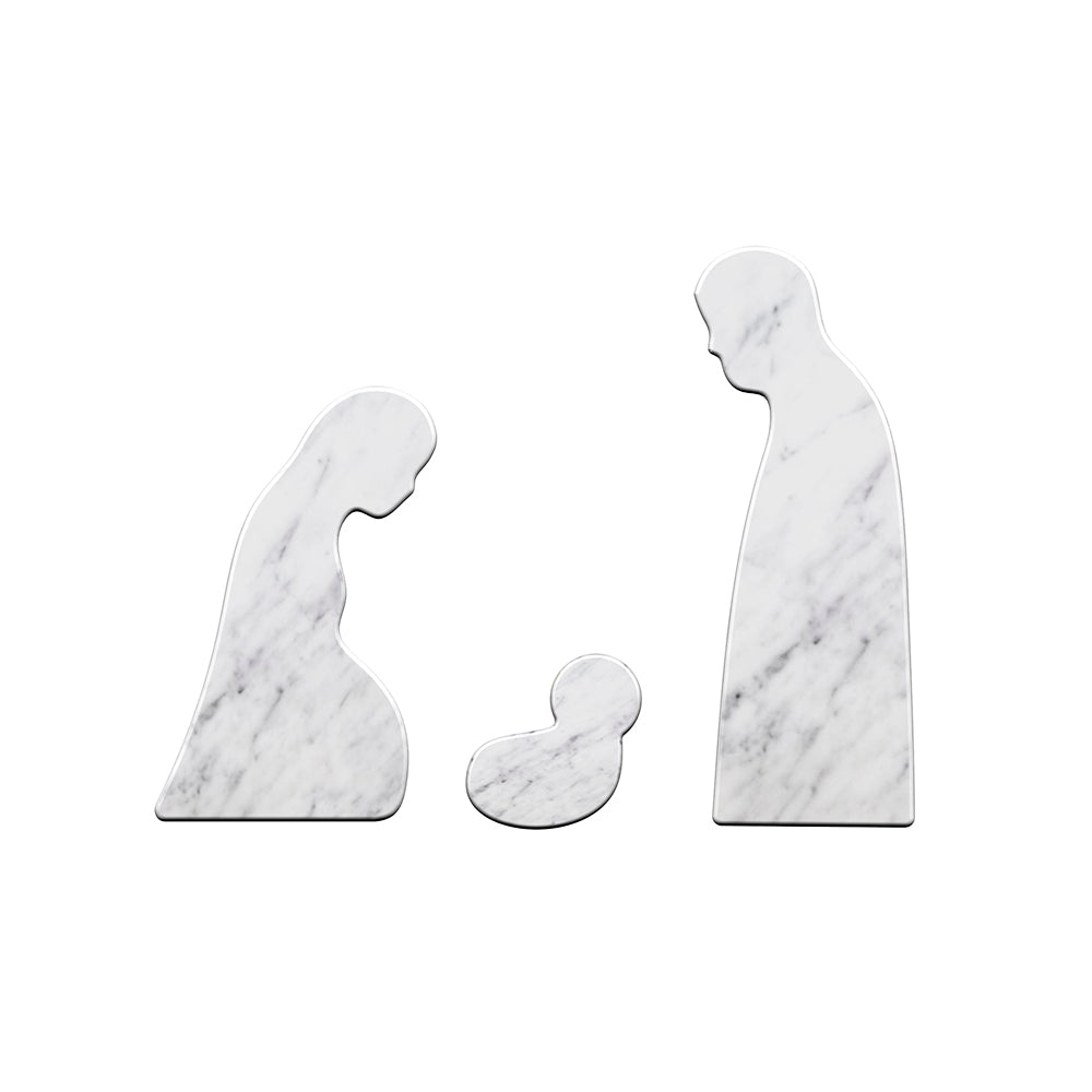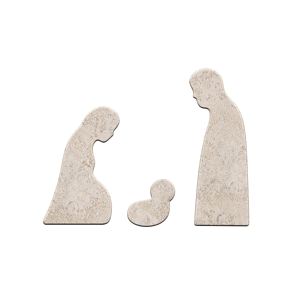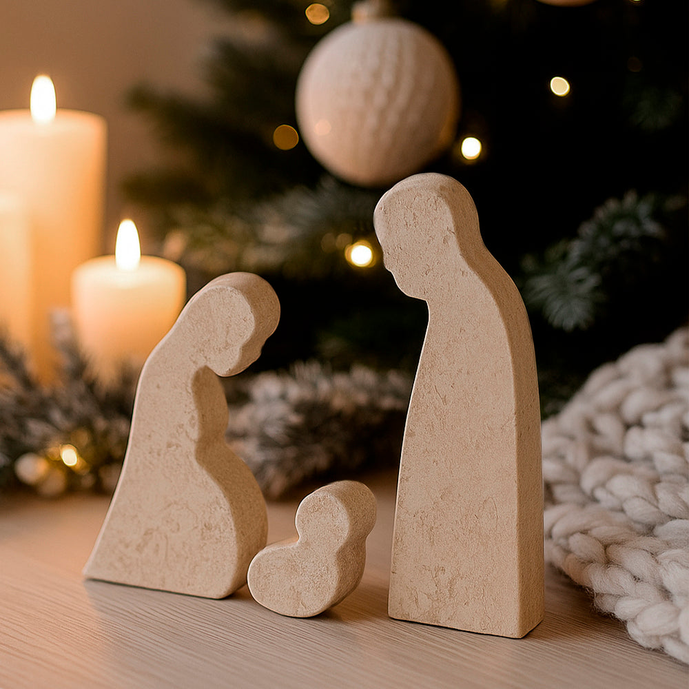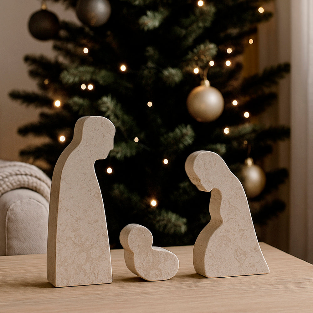 El set incluye tres figuras —la Virgen María, San José y el Niño Dios— representadas a través de siluetas limpias y suaves que transmiten serenidad y belleza en su simplicidad.