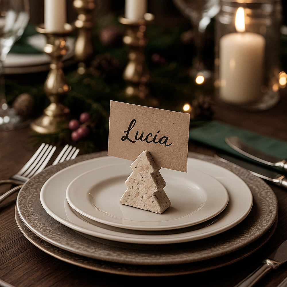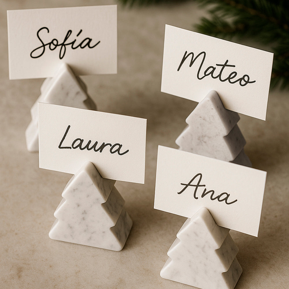 Cada pieza está tallada a mano y pensada para sostener las tarjetas con los nombres de tus comensales, haciendo que cada lugar en la mesa se sienta como un gesto de bienvenida personal.