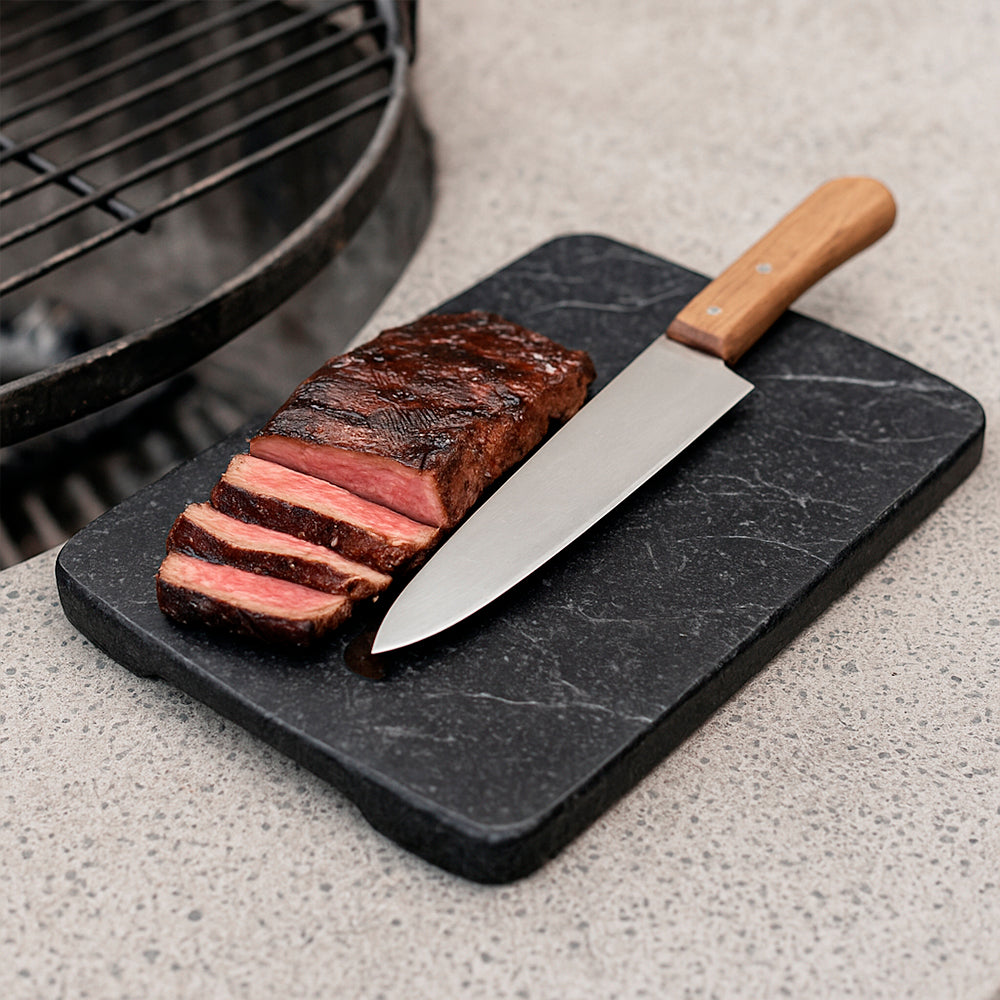 Pensada para los amantes del asador y la cocina bien hecha, esta tabla es tan resistente como estética: el granito no se raya, no se mancha y resiste altas temperaturas, perfecta para picar carne, verduras o colocar directamente alimentos recién salidos del fuego.