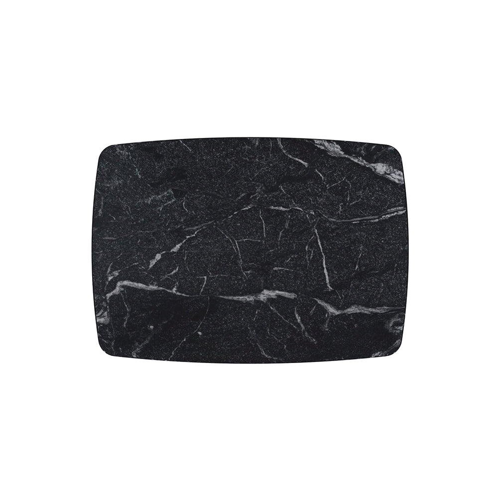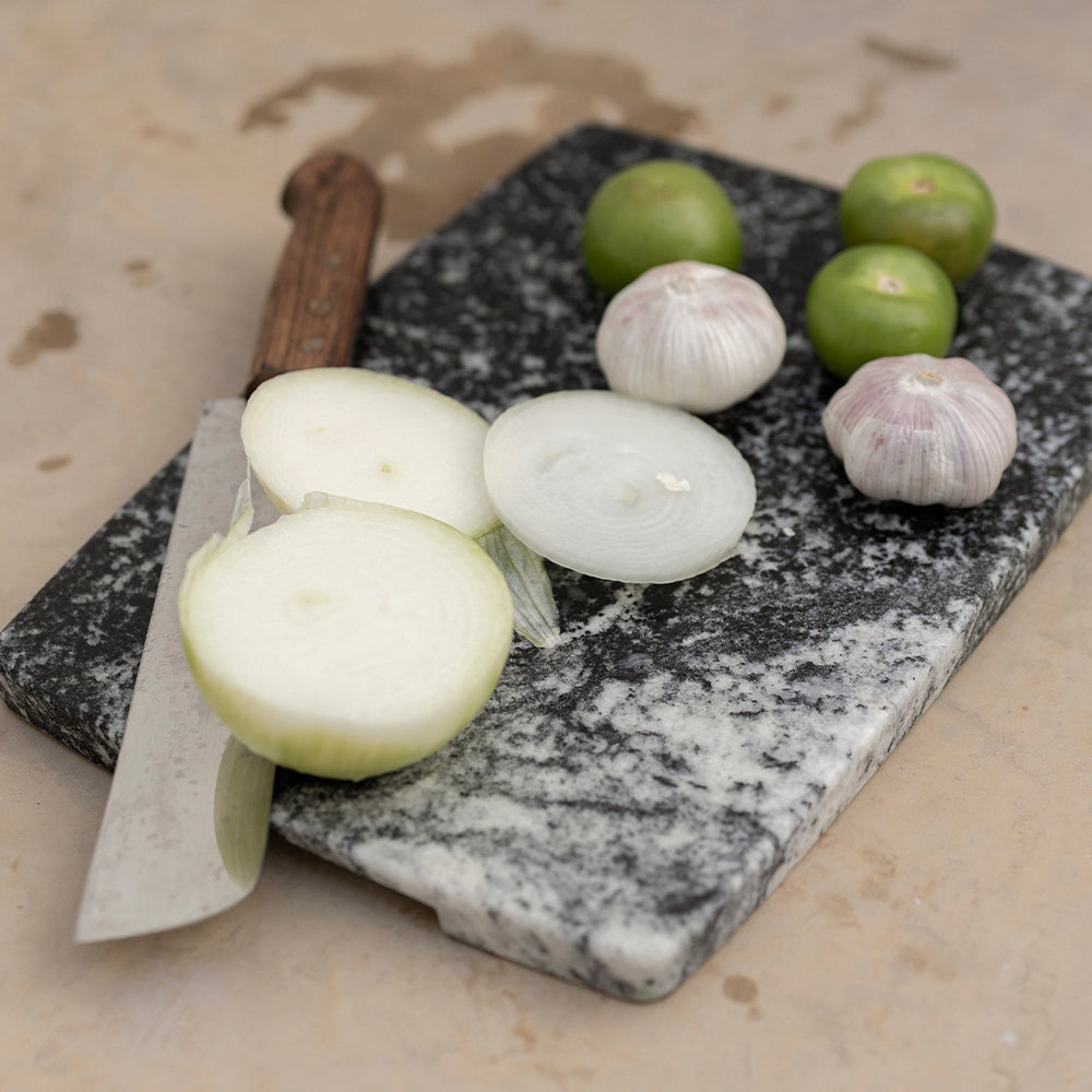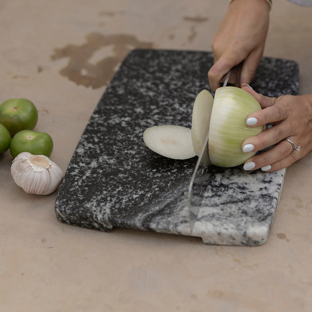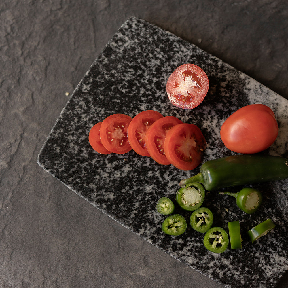 Nuestra Tabla para Picar está hecha a mano de granito negro con vetas blancas y terminado tipo leather que resalta su textura y sofisticación.